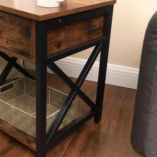 Szafka wykonana w stylu rustykalnym, czyli odpowiednio stylizowanym na wiekowy. Szafka jest stabilna, a więc możemy umieścić ją obok łóżka trzymając na niej wszystkie rzeczy, które chcemy mieć pod ręką, a to wszystko dzięki temu, że szafka posiada również dolną półkę. Szafka nocna będzie idealna do przechowywania książek, budzików, kwiatów w doniczce, możemy też na niej wyeksponować nasze pięknie oprawione zdjęcia.