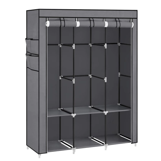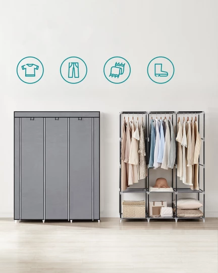 Tekstylna, trzydrzwiowa szafa na ubrania wykonana z stalowych rurek, które stanowią jej stelaż oraz wysokiej jakości materiałów, łatwych do utrzymania w czystości. Poszycie szafki wykonane jest z oddychającego i wodoodpornego materiału zasuwanego na zamki błyskawiczne.