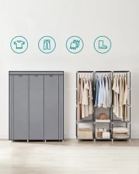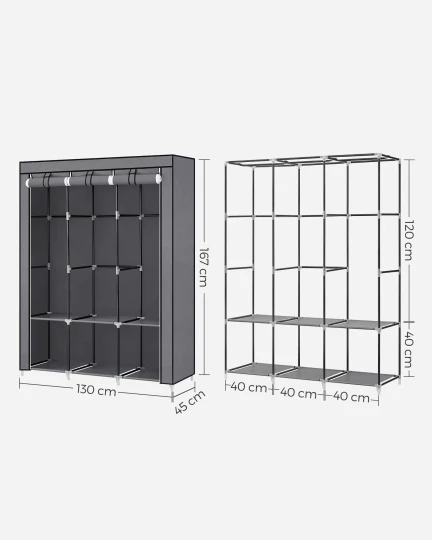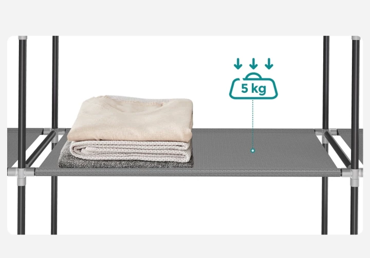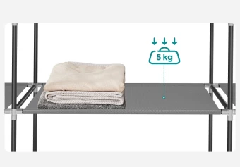Wyjątkowo praktyczna, składana garderoba, posiada 6 półek, które zostały wyprodukowane z wodoodpornego materiału oraz 3 drążki do zawieszania ubrań.