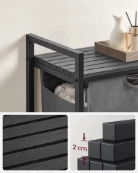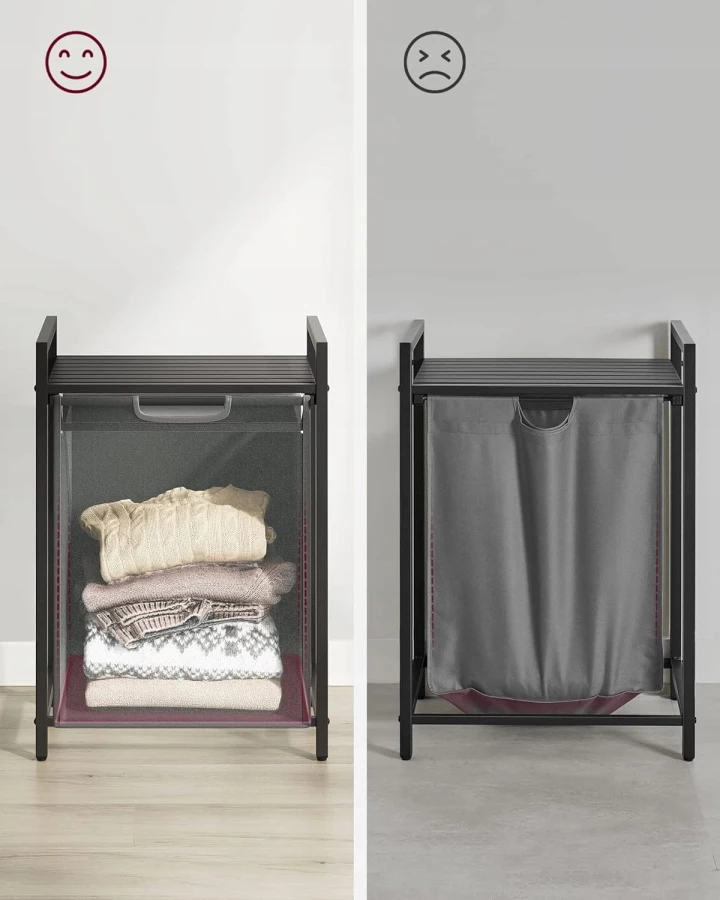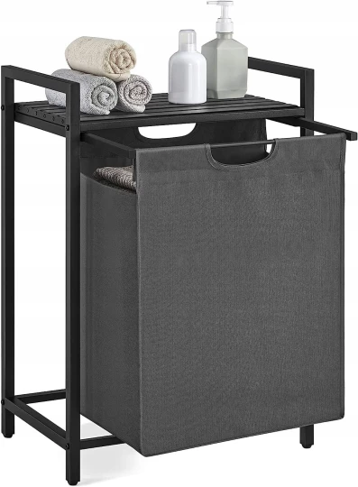 Praktyczny, jednokomorowy kosz na pranie i bieliznę o pojemności 65 l został wykonany z bardzo dobrze prezentujących się listewek z płyty MDF połączonych ze sobą stalową ramą. Odpowiedni dobór materiałów sprawia, że produkt jest odporny na ewentualne uszkodzenia. Pojemnik znajdzie swoje zastosowanie w pralni, łazience, a nawet w pokoju dziecięcym służąc za kosz na zabawki. Już dziś zaprowadź porządek w swoim domu razem z jednokomorowym koszem. Uniwersalność oraz praktyczność sprawią, że kosz będzie jednym z Twoich ulubionych mebli w domu. Meble w stylu loft to ostatni krzyk mody. Kosz na pewno wpasuje się w wystrój niejednego pomieszczenia. Stalowa konstrukcja zapewnia stabilność mebla. Idealnie spasowane elementy ramy oraz czarna oprawa blatu nadadzą Twojemu wnętrzu wdzięku. Zadbaj o estetykę swojej łazienki, pralni czy pokoju dziecięcego wybierając produkty sprawdzone, o najwyższej jakości wykonania.
