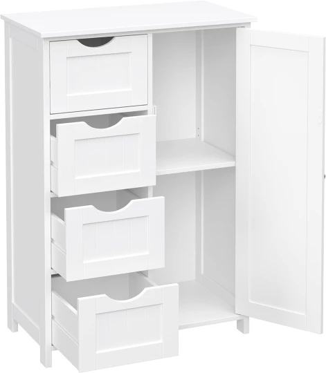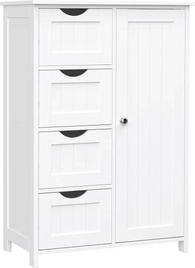 Szafka łazienkowa wykonana w neutralnym kolorze zadowoli niejednego Kupującego. Zorganizuj swoją przestrzeń w łazience z prezentowaną komodą. Dzięki dużej ilości miejsca uporządkujesz ręczniki, kosmetyki czy akcesoria kąpielowe. Co więcej, w zamkniętych przestrzeniach możesz trzymać rzeczy, których nie chcesz mieć na widoku jak np. zapas papieru toaletowego.