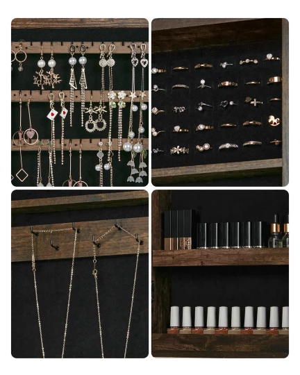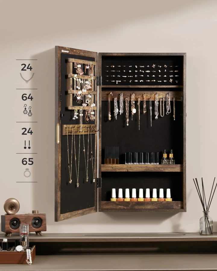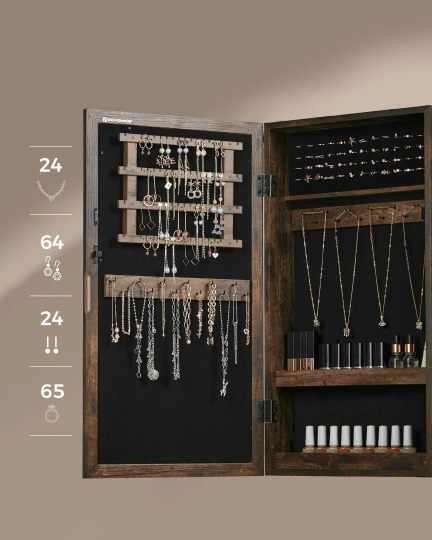 Szafka z lustrem na biżuterię, zegarki, okulary oraz inne cenne przedmioty. Bardzo elegancka i praktyczna szafka wpasuje się w wystrój Twojej sypialni, garderoby czy pokoju, będzie również stanowiła idealny i trafiony prezent dla każdej kobiety.