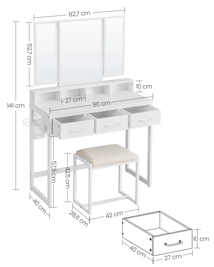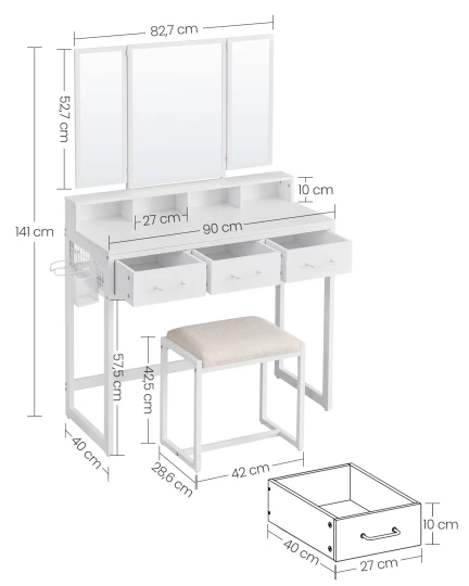 - Wymiary toaletki: 90 x 40 x 141 cm (szerokość x głębokość x wysokość)