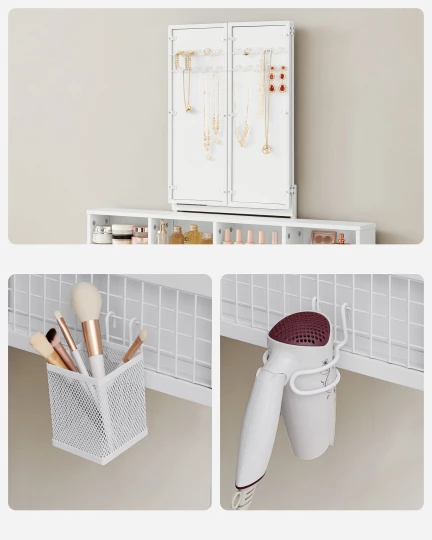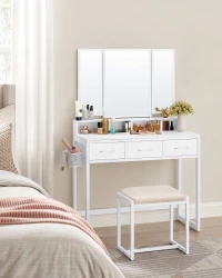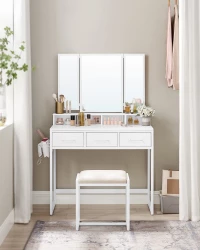 Toaletka jest stabilna, a szeroki blat i 3 pojemne szuflady sprawią, że pomieścisz w niej kosmetyki do makijażu, pielęgnacji twarzy, a także zestaw do manicure hybrydowego. Lustro jest zamykane, także nie ma obawy, że będzie się kurzyć. Dodatkowo boczne drzwi lustra posiadają haczyki na naszyjniki. Cztery przegrody pod nadstawką sprawią, że to co najbardziej potrzebne będzie zawsze pod ręką.