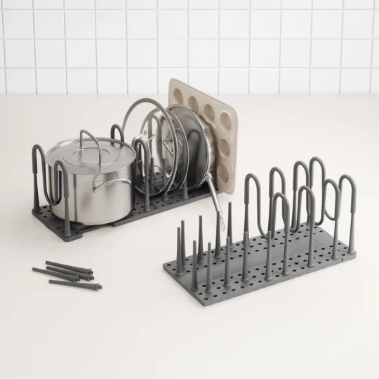 Peggy pozwala przechowywać garnki, patelnie, pokrywki, blachy do pieczenia i inne akcesoria kuchenne w pozycji pionowej, co ułatwia organizację.