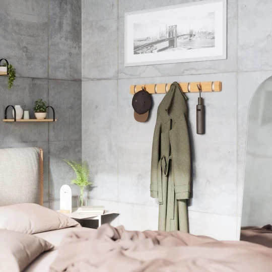 To nowoczesny, funkcjonalny, montowany na ścianie wieszak na ubrania z dużą ilością miejsca.