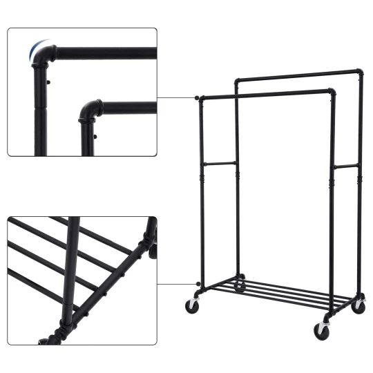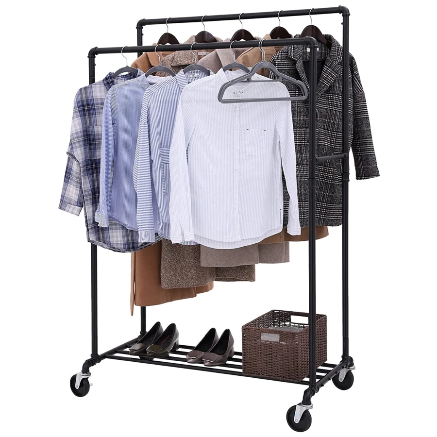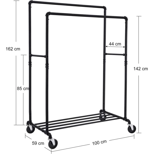 Stojak posiada 2 bardzo stabilne i wytrzymałe drążki, które służą do przechowywania płaszczy, kurtek, sukienek, koszul oraz marynarek. Ponadto na drążku możemy wieszać szale, szaliki czy też kominy. Jest on szczególnie przydatny w sezonie wesel i komunii, gdzie potrzebujemy zdjąć z wieszaka perfekcyjnie wyprasowane koszule czy sukienki.