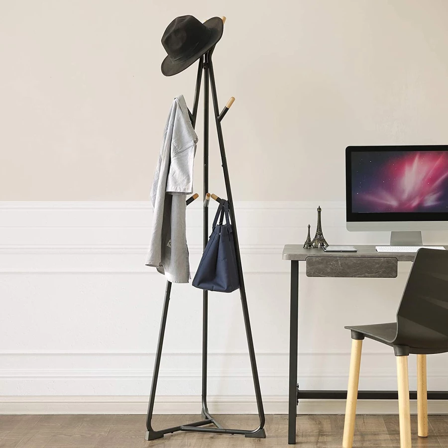 Ten niewiele zajmujący miejsca produkt posiada stabilną trójkątną podstawę, dzięki której mamy pewność, że produkt nie będzie się przechylał wraz z dodatkowym obciążeniem. Ponadto produkt został wyposażony w 9 zaokrąglonych, bukowych haczyków do przechowywania płaszczy, kurtek, toreb czy też szali i czapek.