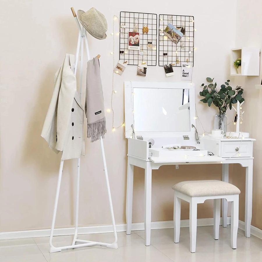 Stalowe elementy zapewniają stabilność mebla, dlatego jest to idealny produkt na każdą porę roku, szczególnie docenimy go w sezonie zimowym, gdy zawieszamy na haki ciężkie kurtki, płaszcze oraz szale i kominy.