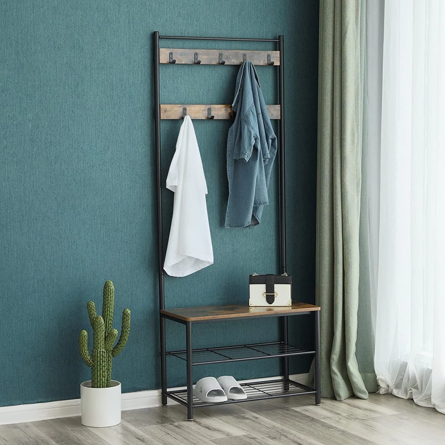 Masz dość bałaganu w przedpokoju czy też korytarzu? Kurtki i płaszcze leżą na krzesłach i fotelach w salonie i jadalni zamiast wisieć na wieszaku? Jeżeli odpowiedź jest twierdząca to dobrze trafiłeś. Prezentujemy stojak na ubrania z siedziskiem i półkami na buty, który wprowadzi ład i porządek. Ten praktyczny mebel uporządkuje Twoją odzież wierzchnią, galanterię oraz inne drobiazgi jak np. klucze.