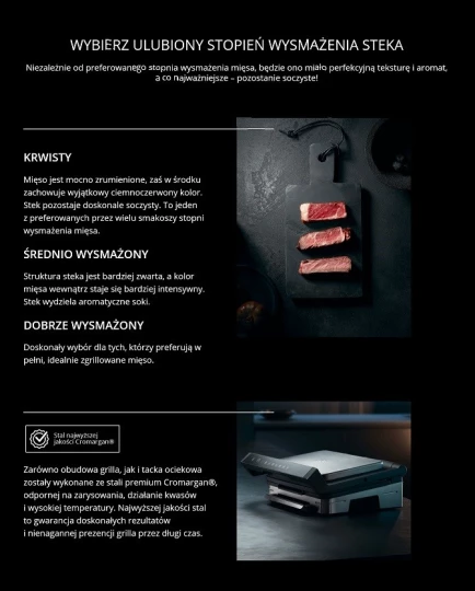 - posiada automatyczne czujniki, które dopasowują temperaturę i czas grillowania do wielkości oraz grubości żywności,
