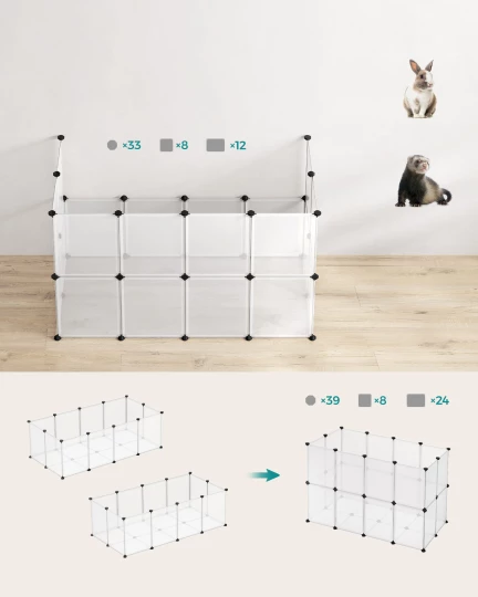 W przypadku chęci użycia zagrody dla zwierząt bardziej skocznych jak królik, fretka czy szynszyla należy zwiększyć wysokość ścianek. W tym celu rekomendujemy dokupienie drugiego wybiegu, aby nie zmniejszyć wolnej przestrzeni, po której będzie poruszało się zwierzę.